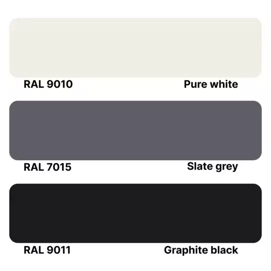 - Colour available: Black (RAL 9011), Grey (RAL 7015), White (RAL 9010)
